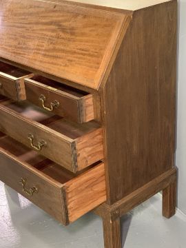VINTAGE MAHOGANY FALL FRONT BUREAU having two short and two long drawers under a sloped fall, on reeded supports, 101.5cms H, 87cms W maximum, 42cms D maximum