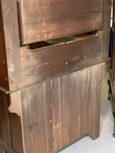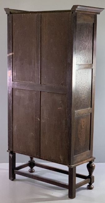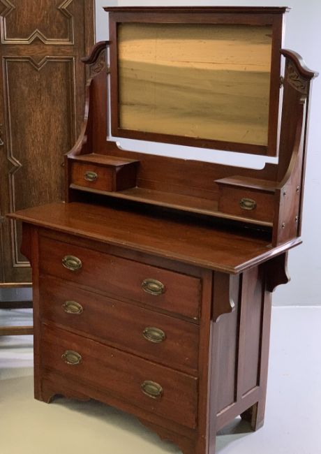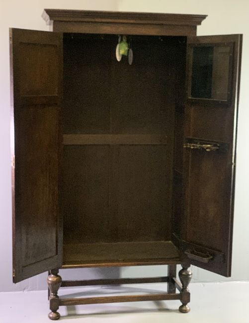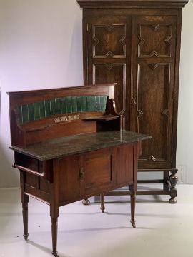 VINTAGE HARLEQUIN BEDROOM SUITE, three items to include a Jacobean style wardrobe, two door with panelled detail, on bulbous supports, 191cms H, 98cms W, 46cms D, mirrored dressing chest (mirror lacking) on three drawers, the mirror section with carved top detail and two small drawers, 158cms H overall, 107cms W, 46cms D and a tile back washstand with black marble top, 120cms H overall, 107cms W, 46cms D