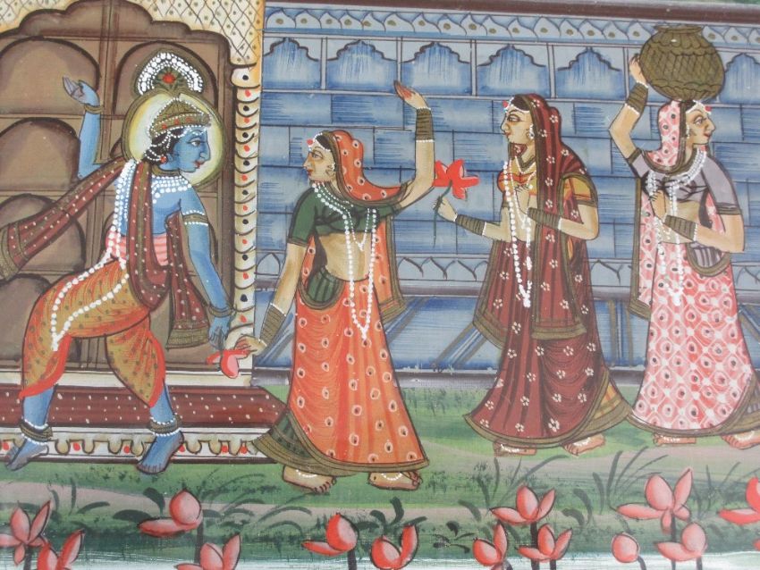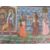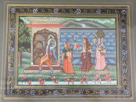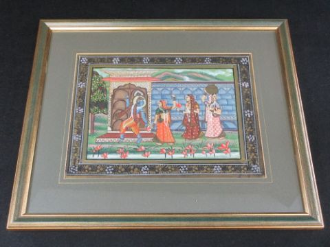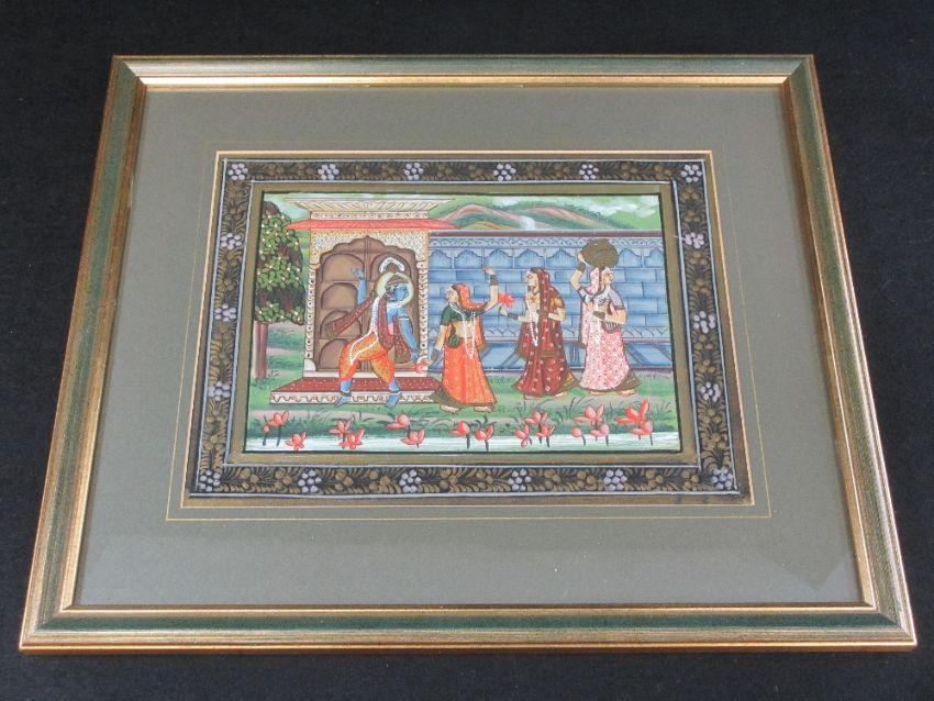 INDIAN SILK PAINTING - depicting women and an Indian deity dancing within a walled garden setting, 22 x 30cms
