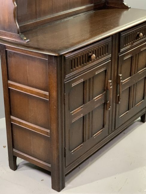 PRIORY STYLE OAK DRESSER, the shaped sided rack with two shelves and carved frieze detail, over a base section of two drawers and two cupboard doors with wooden knobs and handles