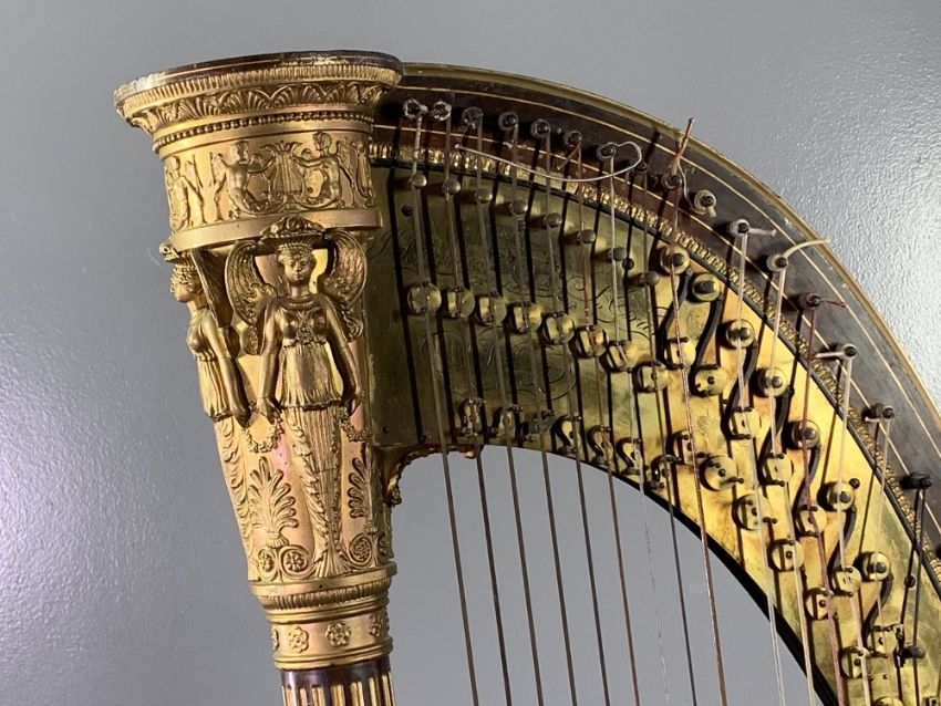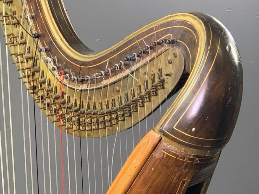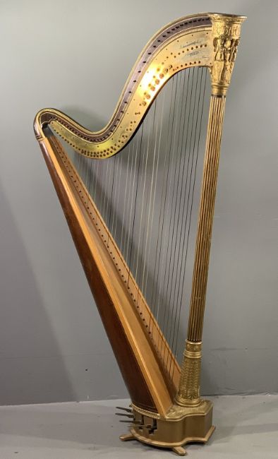 J C SCHWIESO & CO seven pedal patent gilt wood harp, Grecian style in satinwood and rosewood, the reeded column with angelic cap and foot decoration, signed to the brass plate and marked '263 Regent Street, London', mid to late 19th Century, forty three strings (one or two lacking), 172cms H, 80cms W, 36cms D