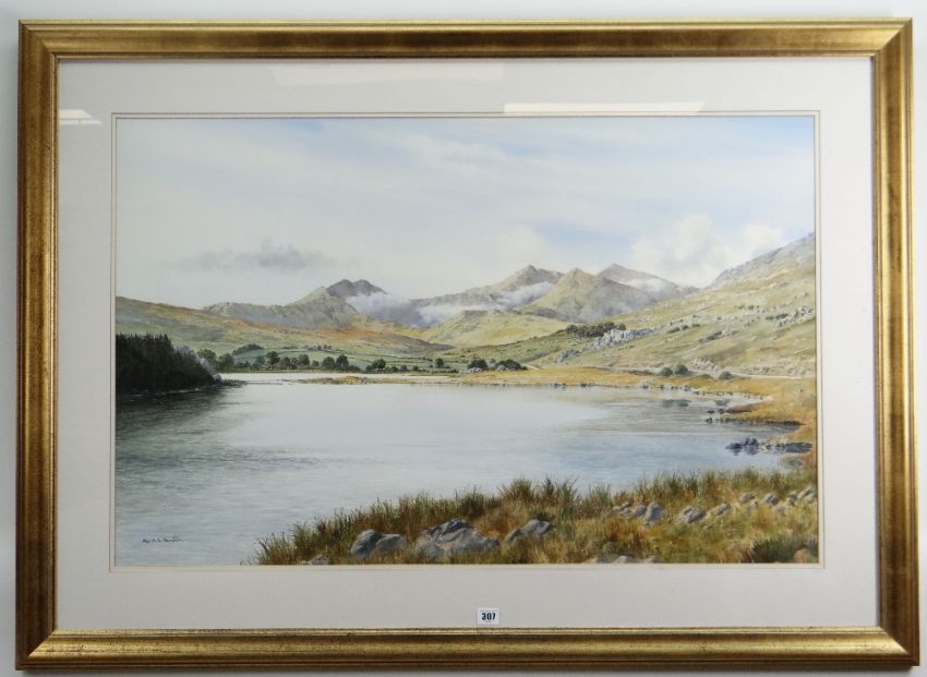 MAX A S HAMBLEN watercolour - expansive scene of Llyn Mymbyr and the Snowdon horseshoe at Llanberis, signed in full, 63 x 101cms