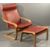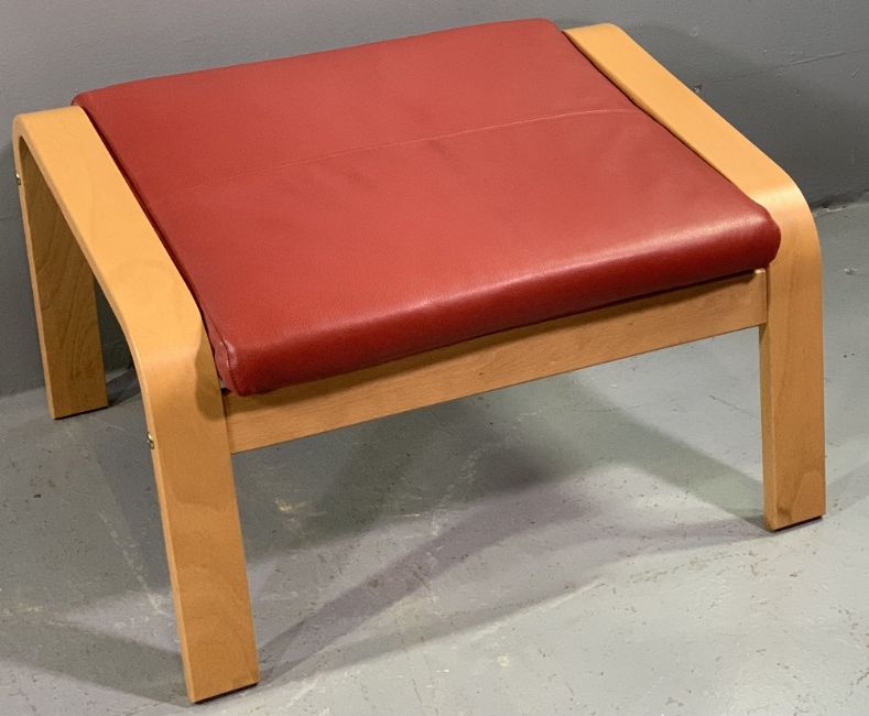 IKEA ULTRA MODERN BENTWOOD ARMCHAIR & MATCHING FOOTSTOOL with red leather effect upholstery, 96cms H, 68cms W, 50cms D the chair seat, 39cms H, 68cms W, 55cms D the footstool