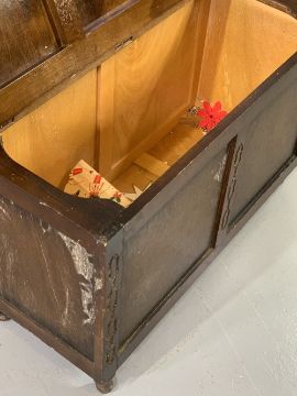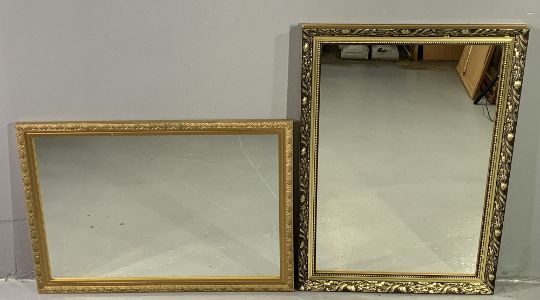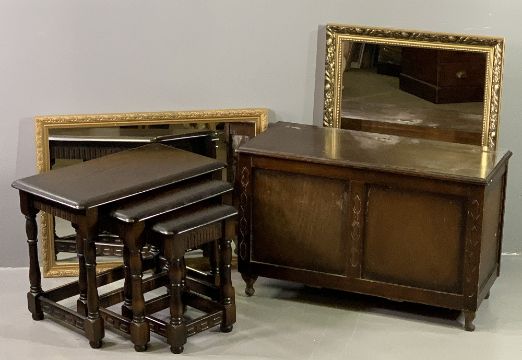 REPRODUCTION OAK FURNITURE to include a set of three Priory style oak tables, 48cms H, 60cms W, 38cms D the largest, an oak lidded small blanket chest, 52cms H, 82cms W, 36cms D and two gilt framed mirrors, 86 x 60.5cms and 80 x 57cms