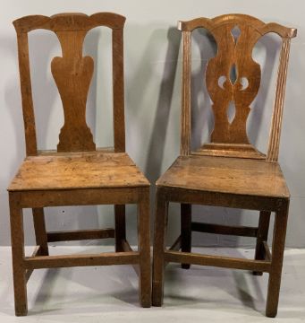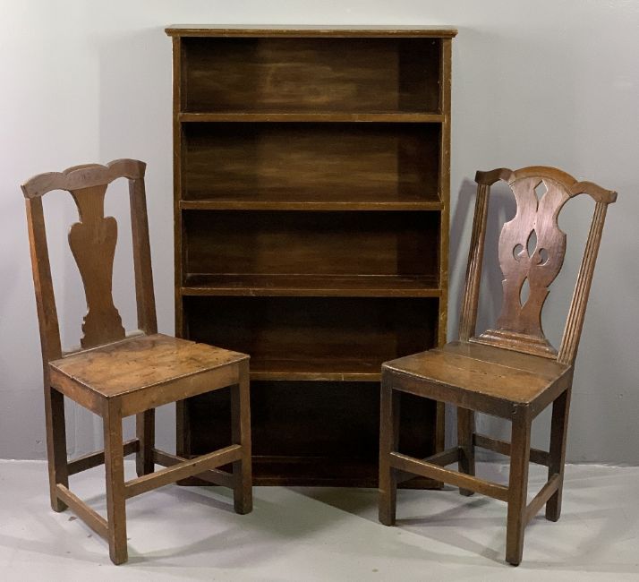 ANTIQUE OAK FARMHOUSE CHAIRS (2), 97cms H, 47cms W, 34cms D the seats approximately and a vintage oak bookcase, 133cms H, 81cms W, 19cms D