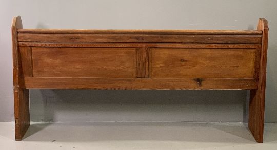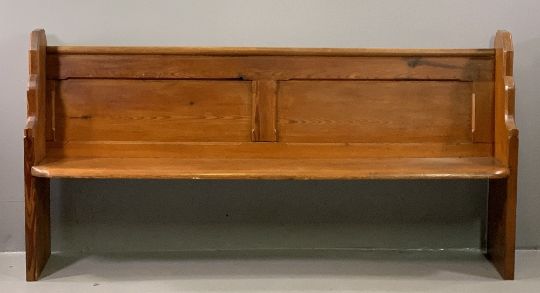VINTAGE PITCH PINE CHURCH PEW with shaped supports, one numbered '26' with open base and panelled back, 96cms H, 190cms W, 39cms D