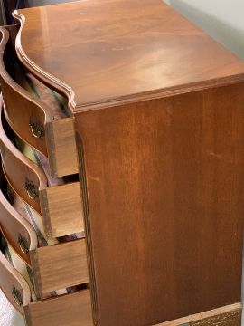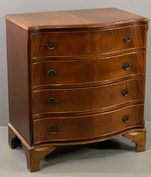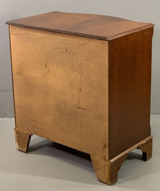 REPRODUCTION MAHOGANY FOUR DRAWER CHEST - serpentine front, on corner bracket feet, 84cms H, 75cms W, 50cms D