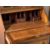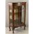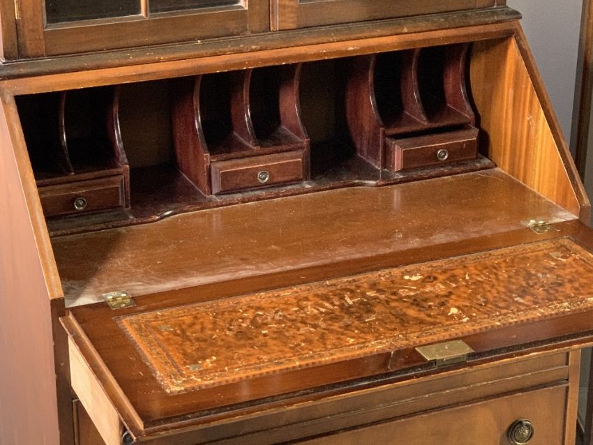 REPRODUCTION BUREAU BOOKCASE/MARRIAGE having a twin double top over twin glazed doors with interior shelving above a sloped fall with Sheraton type shell inlay, gilt tooled leather interior writing surface and an arrangement of drawers and pigeonholes, on a four drawer base and corner bracket feet, 168cms H overall, 82cms W, 46cms D and a single door mahogany china display cabinet, 112.5cms H, 60cms W, 35.5cms D