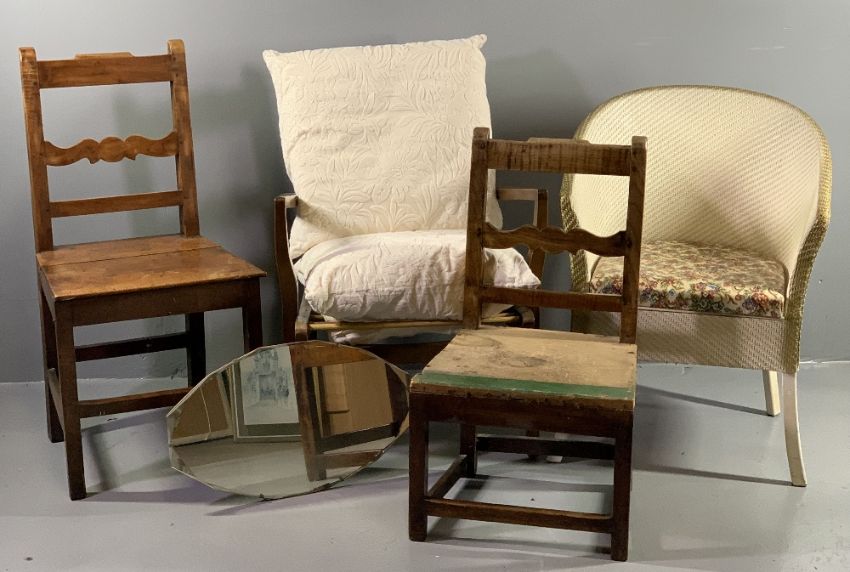 ANTIQUE & LATER CHAIRS (4) to include two oak and elm farmhouse chairs, Lloyd loom style tub chair and a cintique upholstered armchair also an open bevelled edge wall mirror