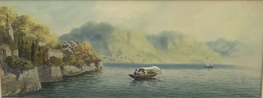 CONTINENTAL WATERCOLOUR - boat on a lake titled 'Castagnola Lago Maggiore', indistinctly signed lower right, 23 x 58cms