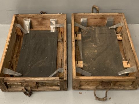 TWO LAND ROVER RADIATOR TRANSIT BOXES, 22cms H, 86cms W, 60cms D