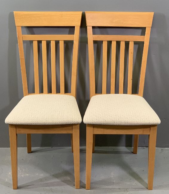 MODERN LIGHT WOOD BLOCK EFFECT BREAKFAST/DINING TABLE, 74cms H, 120cms W, 75cms D and four high backed chairs with oatmeal upholstered seat pads, 97cms H, 44cms W, 42cms D the seat