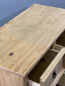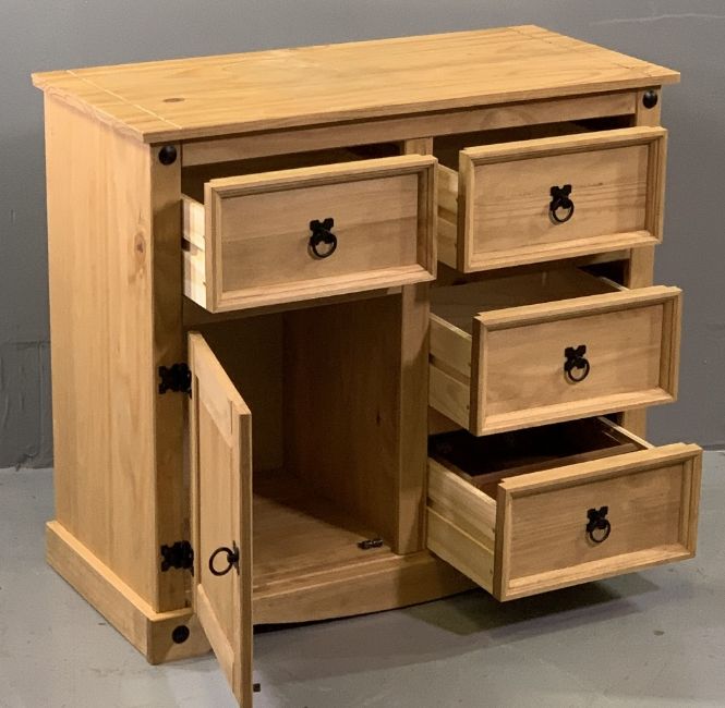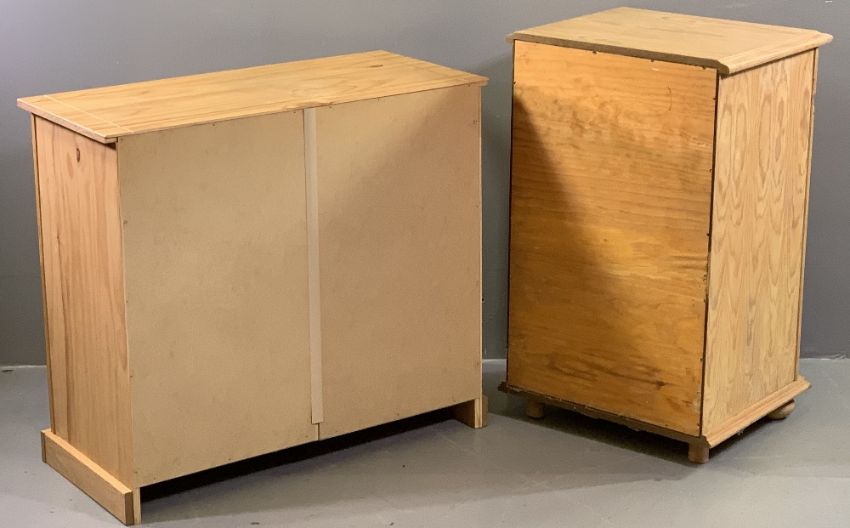 MODERN PINE HOUSEHOLD FURNITURE ITEMS (2) to include a Mexican pine sideboard of four drawers with single cupboard door, 77cms H, 86cms W, 40cms D and a chest of five drawers having white porcelain knobs, on bun feet, 86cms H, 53cms W, 45cms D