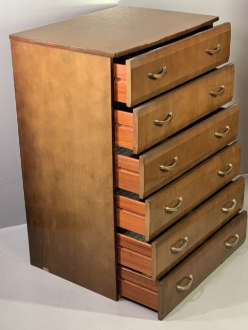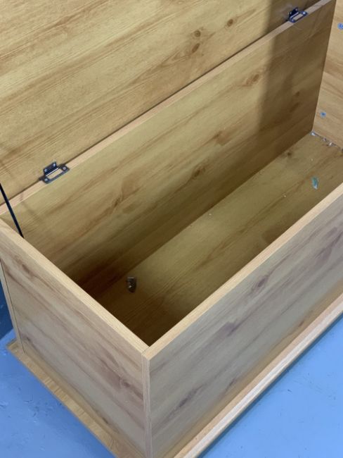 BEDROOM FURNITURE PARCEL - mid Century and reproduction pine effect to include a six drawer chest, 93cms H, 66cms W, 46cms D, a pine effect blanket box on bun feet, 47.5cms H, 99cms W, 43.5cms D, pair of smaller examples and a modern piano stool