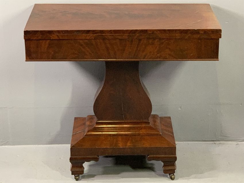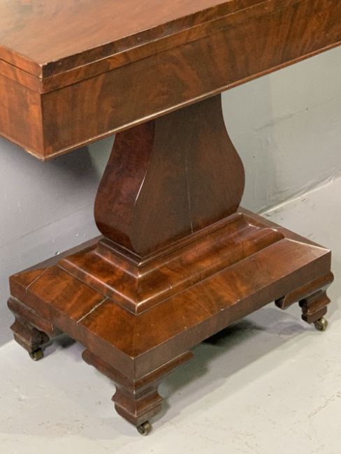 REGENCY MAHOGANY FOLDOVER TEA TABLE with interior storage compartment, on a shaped column and a stepped rectangular base with shaped bracket feet and brass castors, 80cms H, 88cms W, 44cms D (closed), 88cms (fully open)