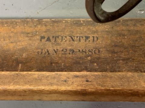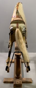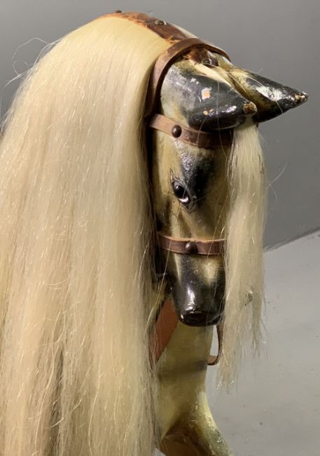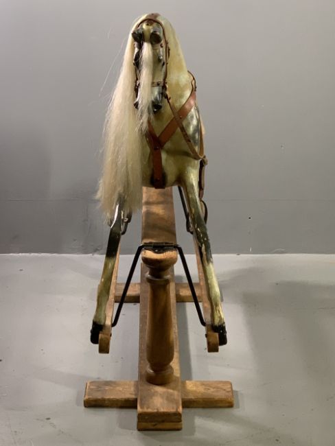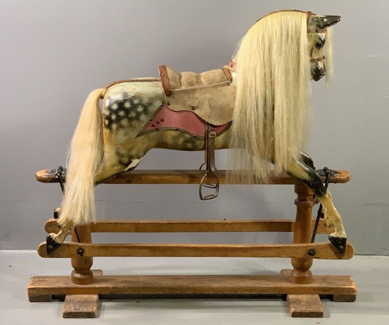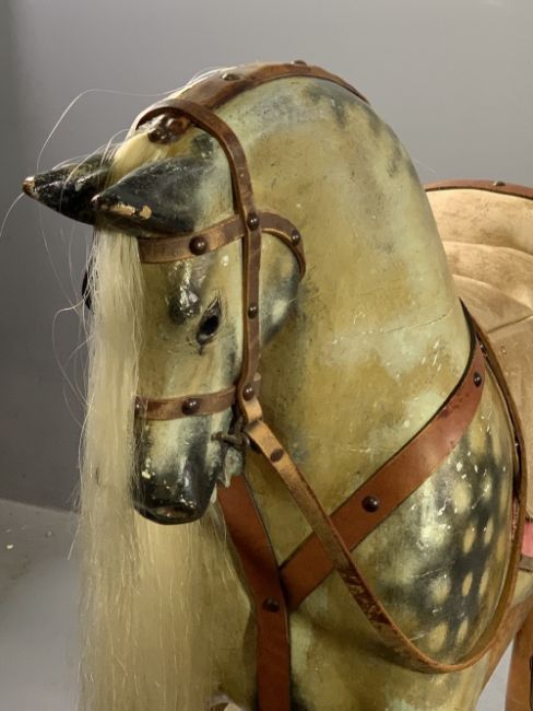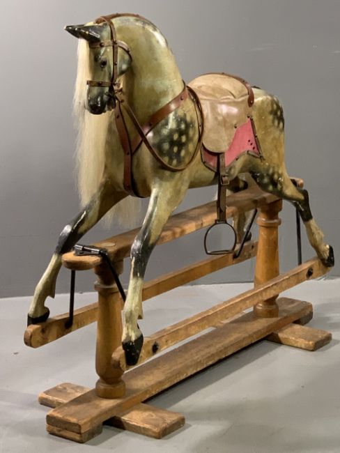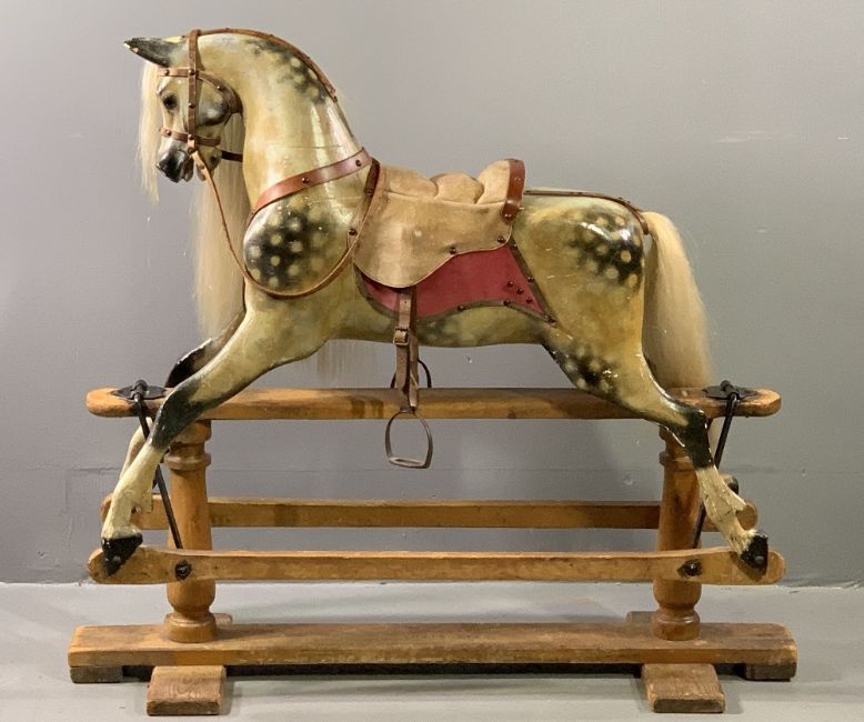 VICTORIAN DAPPLE GREY ROCKING HORSE by G & J Lines, patented January 29, 1880, believed to be the 'Sporty Boy' model with white mane and tail, with a hide and leather saddle and metal stirrups, carved and painted wood supported on a pillared rocking cradle stand, 110cms H maximum, 43cms W, 123cms L, reportedly owned by four generations of the same family since 1900, restoration receipt circa 1990 by The Rocking Horse Workshop, Shropshire, now requiring further restoration