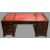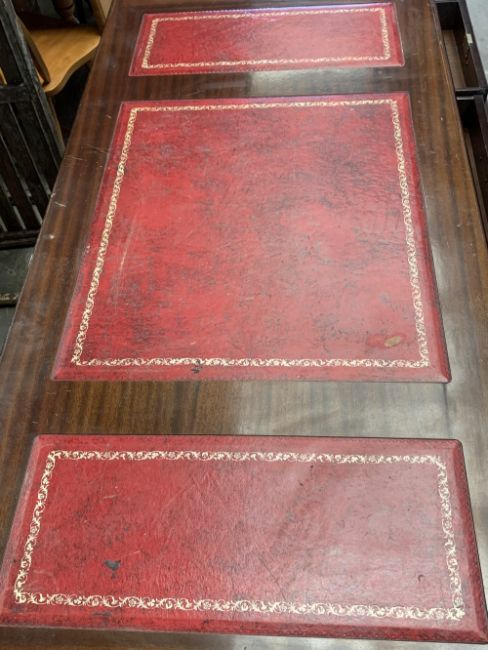REPRODUCTION DESK - large example with three section red tooled leather effect surface, twin pedestal, 77cms H, 183cms W, 92cms D