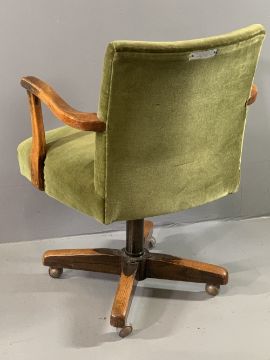VINTAGE OAK UPHOLSTERED OFFICE ARMCHAIR, swivel, rise and fall action, in green velour upholstery, 87cms H, 58cms W, 40cms D the seat