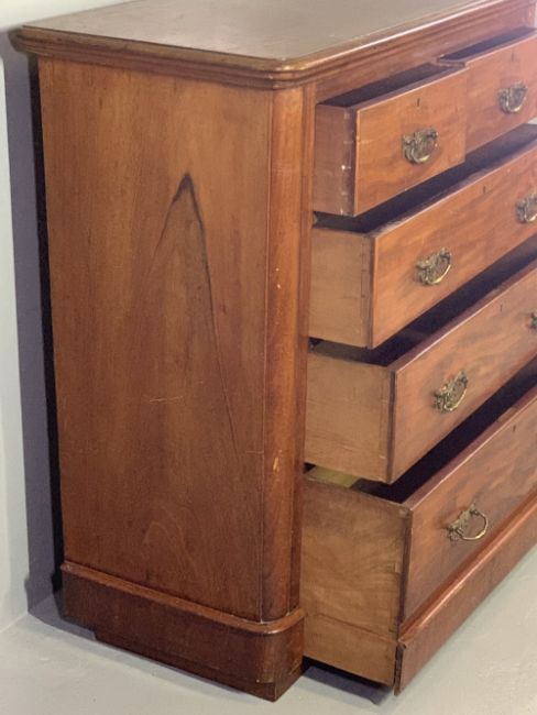 VICTORIAN MAHOGANY ROUNDED CORNER CHEST of two short over three long drawers, on a plinth base, the drawers having fancy pierced brass backplates and swing handles, 105cms H, 104cms W, 46cms D