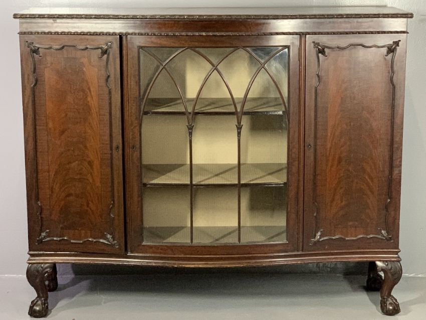 CLASSICALLY STYLED MAHOGANY CHINA CABINET, serpentine front, side by side cabinet with fancy moulding detail over a single glazed central door with arched beading and interior shelving, flanked by twin cupboard doors with carved moulded detail, on ball and claw supports, 124cms H, 153cms W, 46cms D