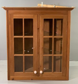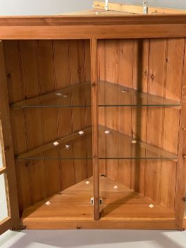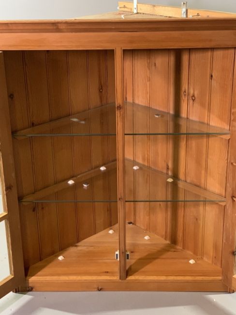 ANTIQUE EFFECT PINE TWO DOOR GLAZED WALL HANGING CORNER CUPBOARD with interior glass shelving, 112cms H, 105cms W