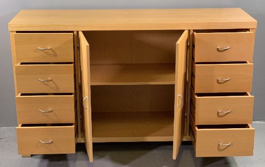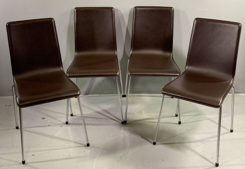 ULTRA MODERN DINING ROOM SUITE (6 items) to include a Next Oslo sideboard, 89.5cms H, 149cms W, 42cms D, light wood and chrome extending dining table, 76cms H, 120cms L (closed), 80cms D, 160cms L (fully open) and four pre-formed brown leather effect covered chairs with chrome legs, 87cms H, 42cms W, 38cms D the seats