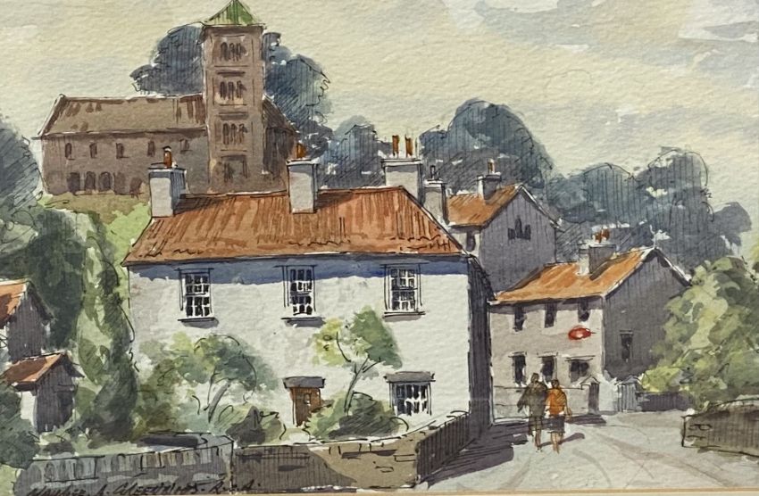 MAURICE A GREENWOOD RCA watercolours, two - townscape with figures walking, signed, 18 x 28cms, whitewashed cottage on a lane, signed, 25 x 35.5cms and a pen and ink sketch of sheep on a hillside, 21 x 31cms