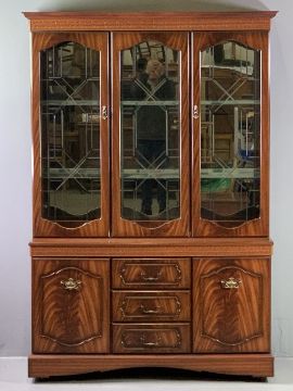 REPRODUCTION MAHOGANY DISPLAY SIDEBOARD having three doors with cut detail, glass top, mirrored interior with glass shelves over a base section of three central drawers and flanking cupboard doors on a plinth base, 191cms H overall, 127.5cms W maximum, 43.5cms D
