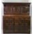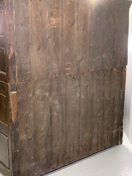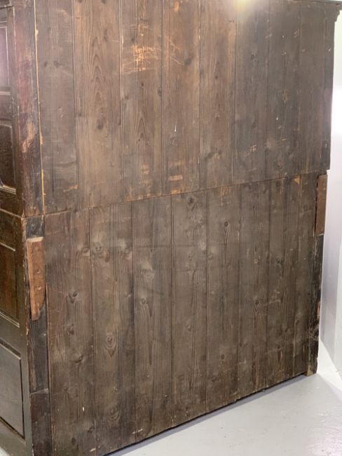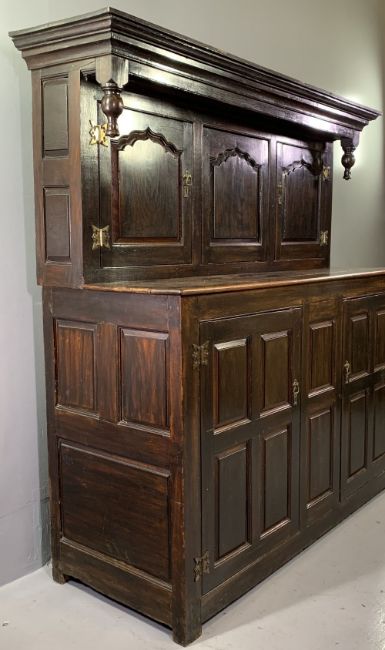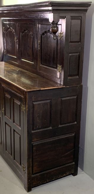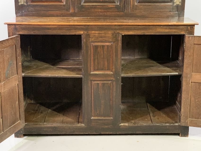 ANTIQUE OAK & LATER BUFFET SIDEBOARD, the top section with overhang to the cornice and turned detail, over twin cupboard doors and central panel, over a base section with twin cupboard doors all having fancy brass hinges, peg-joined construction on stile feet, 158cms H, 144cms W, 57cms D