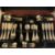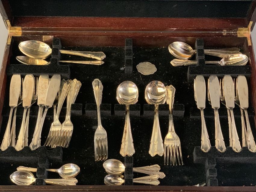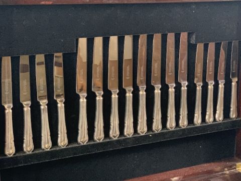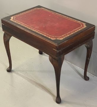 COOPER LUDLAM CANTEEN TABLE OF EPNS CUTLERY having a red tooled leather top, on cabriole supports, eight place setting to the interior, eighty two pieces (one large teaspoon missing, one non-matching fork included)