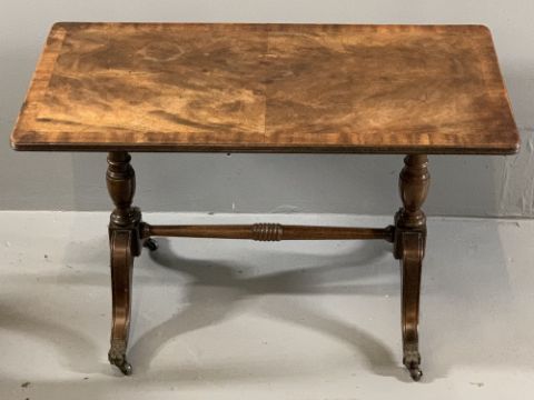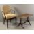 REPRODUCTION CROSSBANDED MAHOGANY COFFEE TABLE, 49cms H, 81cms W, 43cms D and a vintage Parker Knoll armchair, 95cms H, 58cms W, 38cms D along with two Edwardian salon chairs having green velvet upholstered seats, on turned front supports, 85cms H, 43cms W, 40cms D the seat