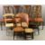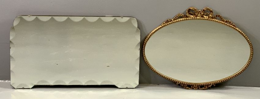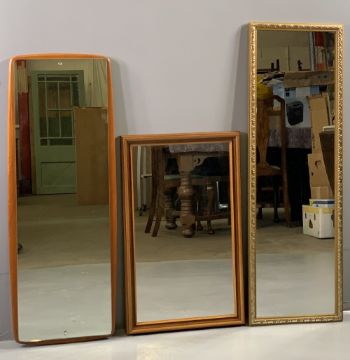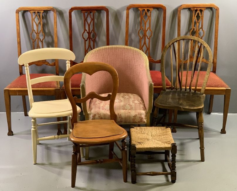 ANTIQUE MAHOGANY DINING CHAIRS - set of four with fretwork backs and red upholstered pad seats, also loom type tub chair and three other assorted vintage chairs together with five decorative and dressing mirrors