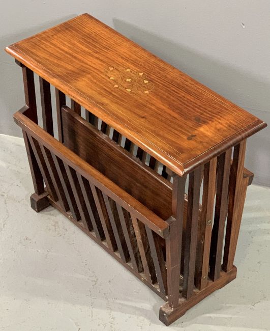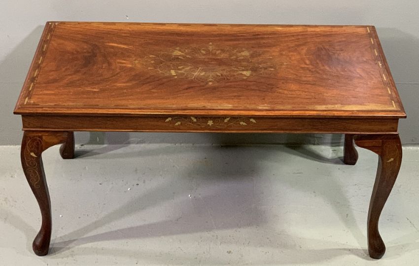 REPRODUCTION BRASS INLAID HARDWOOD COFFEE TABLE, 45cms H, 92cms W, 48cms D and a magazine rack, 44cms H, 53cms W, 25cms D