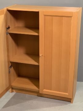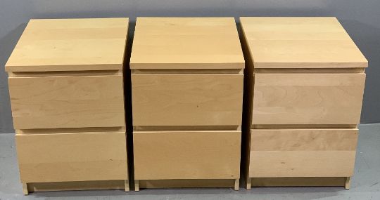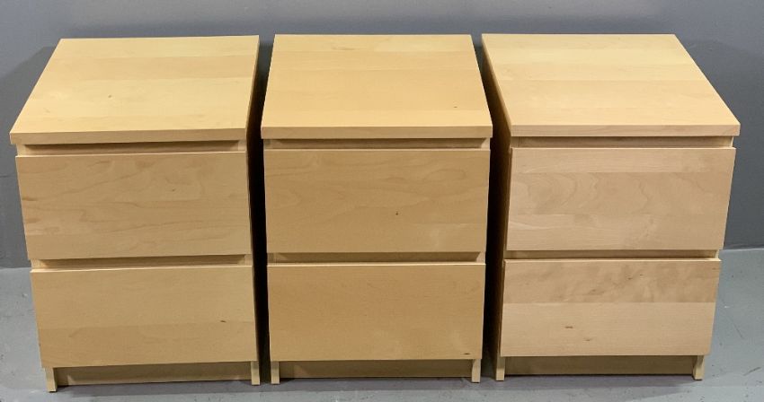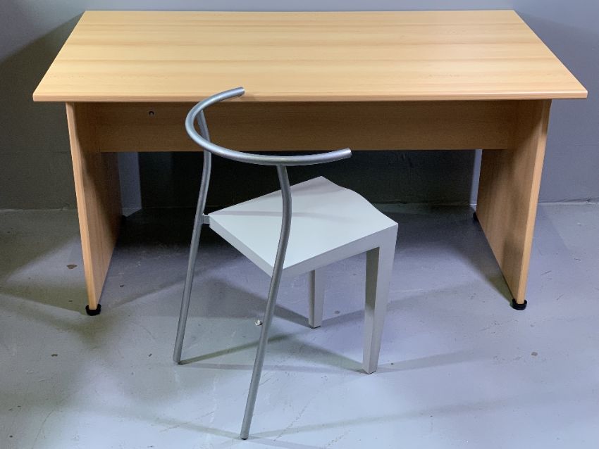 IKEA ULTRA MODERN LIGHT WOOD EFFECT HOME OFFICE FURNITURE to include a desk/table, 72cms H, 140cms W, 80cms D, Ikea 'Billy' two door stationery cupboard, 106cms H, 80cms W, 30cms D, an open bookshelf with two extra shelves, 106cms H, 60cms W, 28cms D and three Ikea 'Maim' two drawer chests/filing cabinets, 55cms H, 40cms W, 48cms D along with a metalwork framed chair marked 'Kartell of Italy, Dr Glob by Stark', 72cms H, 40cms W, 35cms D the seat