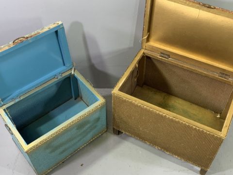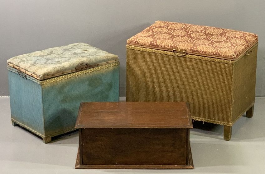 LINEN/STORAGE BOXES (3) - Lloyd loom style and vintage oak, 43cms H, 55cms W, 35.5cms D; 36cms H, 46cms W, 30cms D and 20cms H, 51cms W, 30cms D