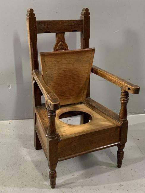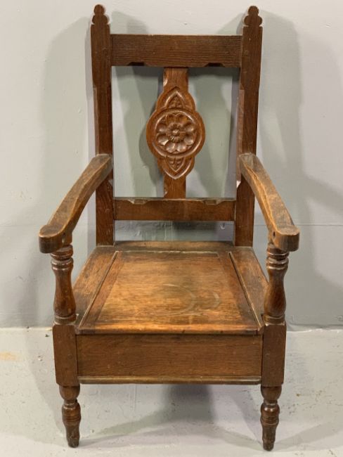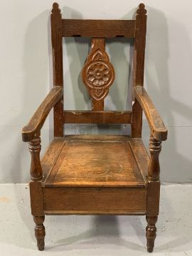 CARVED OAK CHILD'S ARMCHAIR COMMODE, the lift-up seat with interior potty aperture, peg-joined construction, 63cms H, 33cms W, 29cms D the seat