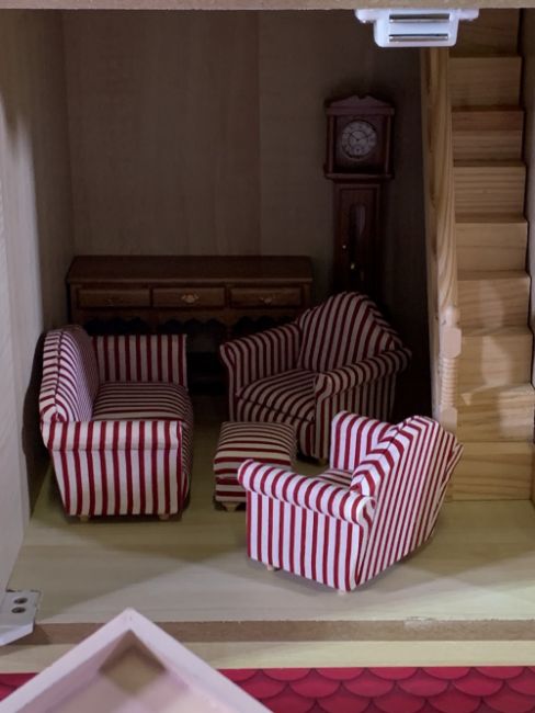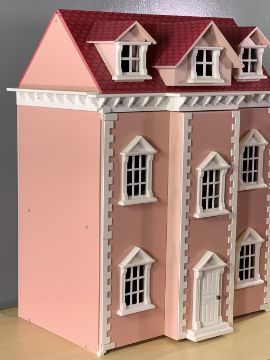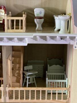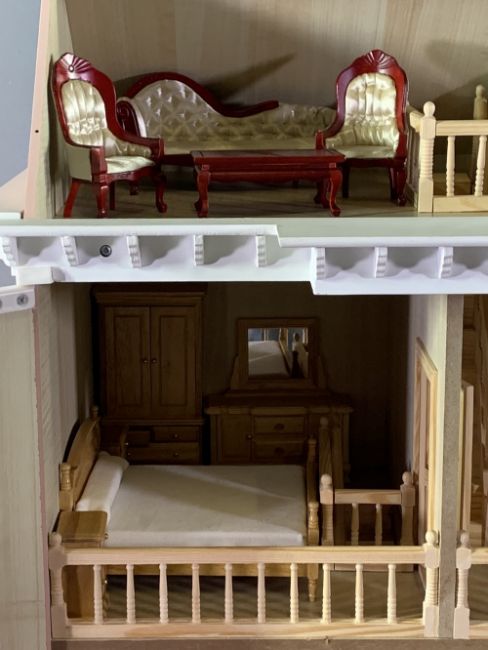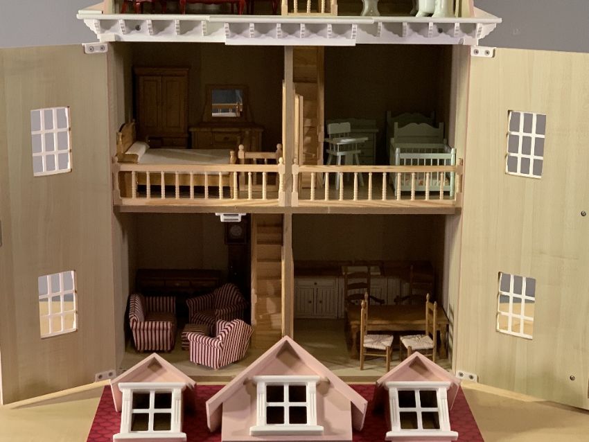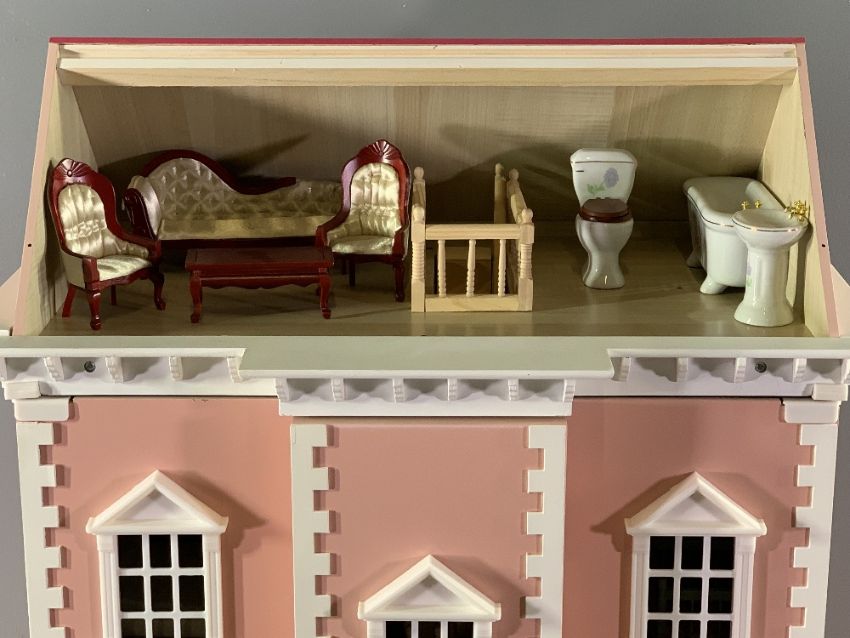 VICTORIAN STYLE DOLL'S HOUSE with furniture contents, 69cms H, 56cms W, 40cms D