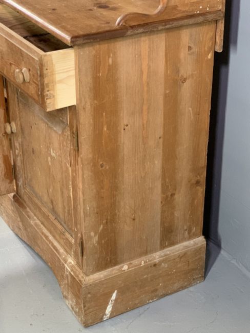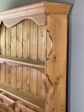 REPRODUCTION PINE DRESSER - the shaped rack with two upper shelves and four lower drawers over a base section of three frieze drawers and three lower cupboard doors on a shaped apron base, 192.5cms H, 151cms W, 42cms D