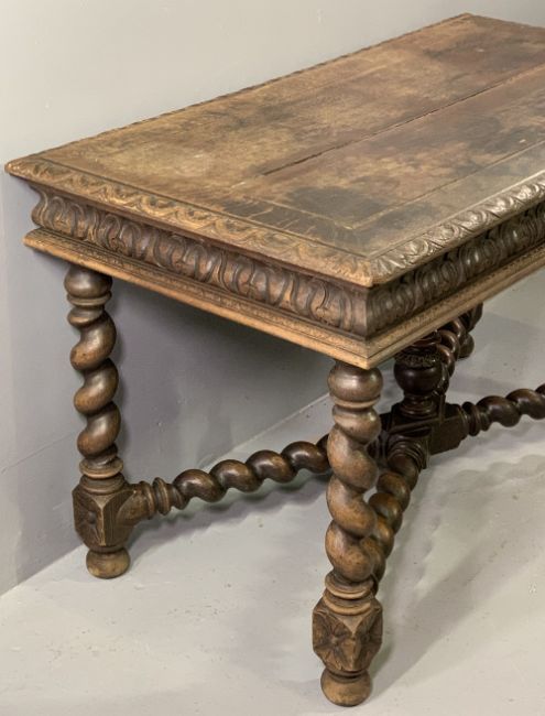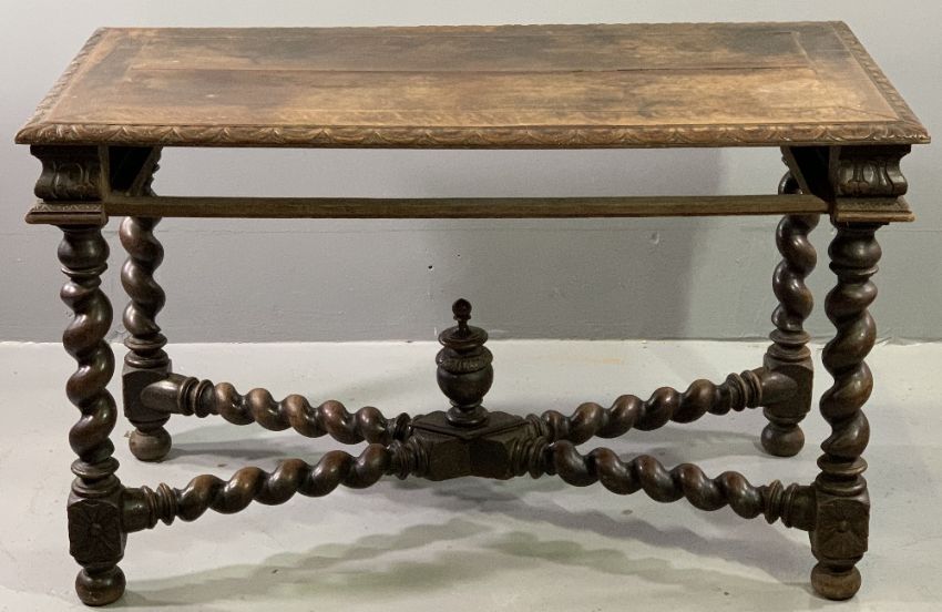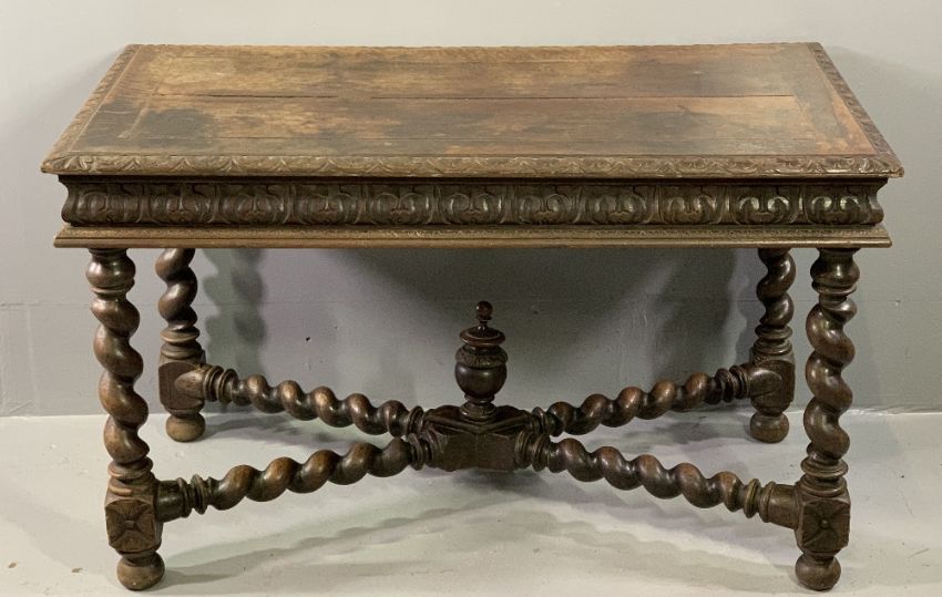 JACOBEAN STYLE OAK LIBRARY TABLE with carved edge and frieze detail, on barley twist supports with urn capped cross-stretcher (lacking single frieze drawer), 72cms H, 120cms W, 65cms D