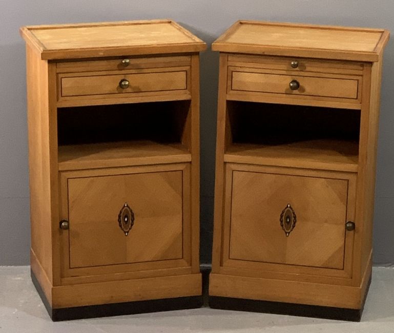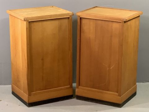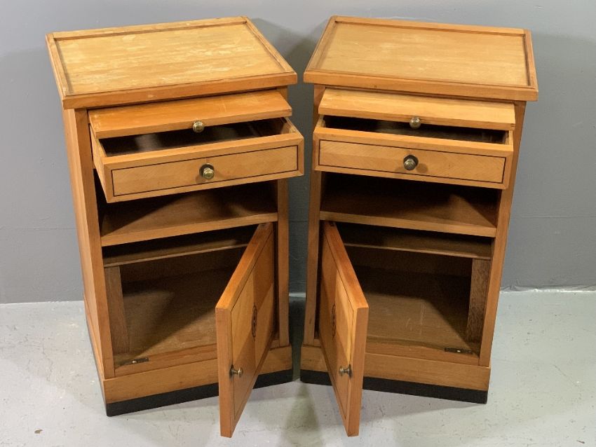 PAIR SATINWOOD EX-SHIP'S CABIN BEDSIDE CABINETS - tray form top (glass missing) above a brushing slide and open shelf with lower base cupboard, 79cms H, 47cms W, 40cms D