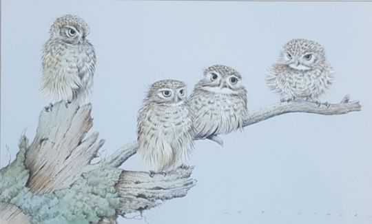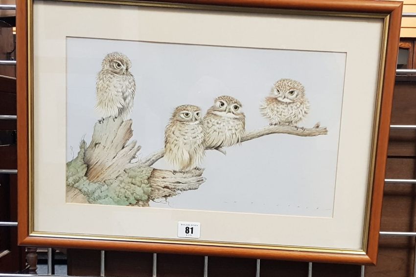 MICHAEL J CLARKE watercolour - entitled 'Little Owls', 36 x 52cms, glazed and framed in light oak with gold border