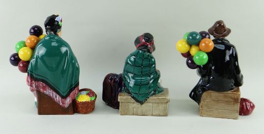 THREE ROYAL DOULTON BONE CHINA FIGURES, comprising 'Silks & Ribbons' HN2017 , 'The Old Balloon Seller' HN1315 , 'The Balloon Man' HN1954 (3)