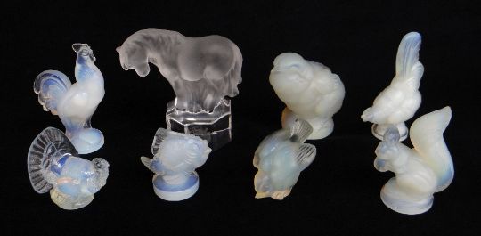 ASSORTED SABINO OPALESCENT GLASS ANIMAL MODELS, including hen, cock, chick, squirrel, fish, turkey and a Goebel clear glass pony (8)