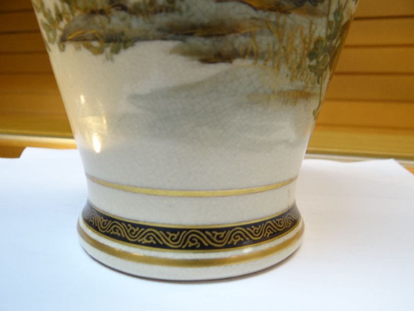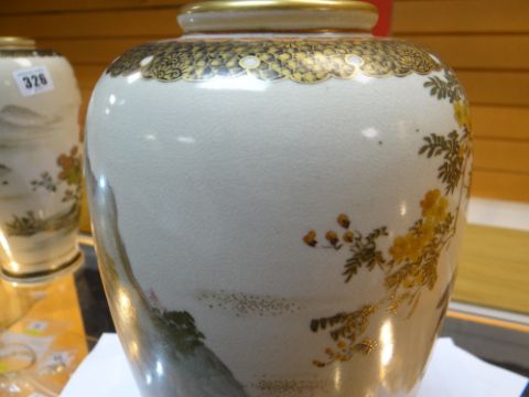 PAIR OF JAPANESE SATSUMA VASES, painted with Peony, Prunus, and Chrysanthemum, with birds in flight, reversed with a mountainous landscape with pavilions, base with two character mark, 24.5cms high (2)There is light gilt wear to both and some faint scratches.