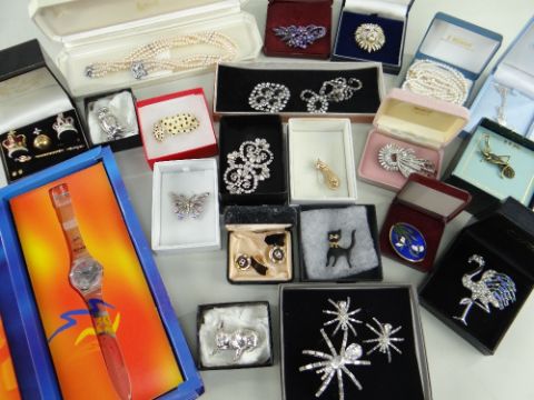 ASSORTED COSTUME JEWELLERY comprising various bar brooches including '1928 Jewelry Co', 'Monty Don', 'Butler & Wilson' jewellery suite, pearls, Millennium Sydney 2000 Swatch wristwatch, The Miniature Crown Jewel Collection ETC