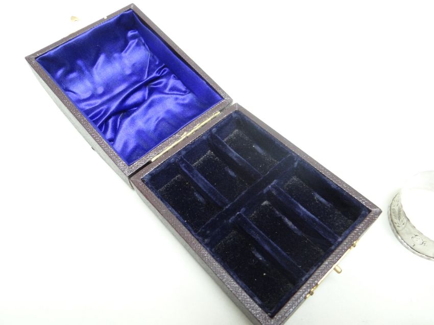 VICTORIAN BOXED SET OF NAPKIN RINGS, Matthew Boulton, Birmingham 1887, floral chase and numbered 1-6 with initials F, and GEORGE V BOXED CHRISTENING SET, London 1927, tot appr wt. 6.5ozt (2)