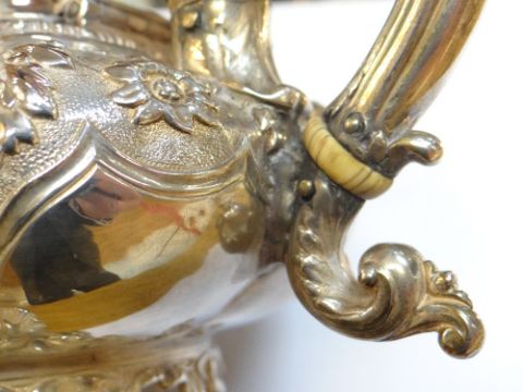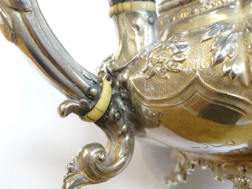 GEORGE IV SILVER MELON SHAPED TEAPOT, Rebecca Emes & Edward Barnard I, London 1827,of circular squat design, overall decorated with flowers and foliage, flower head finial, appr. wt. 16ozt Provenance: deceased estate Powys, consigned via our Carmarthen OfficeComments: some wear on the hinge, possible restoration, lid closes nicely. Handle base is soldered to the body, staining on the inside, hallmarks badly rubbed, one small dent in the side (see photographs)
