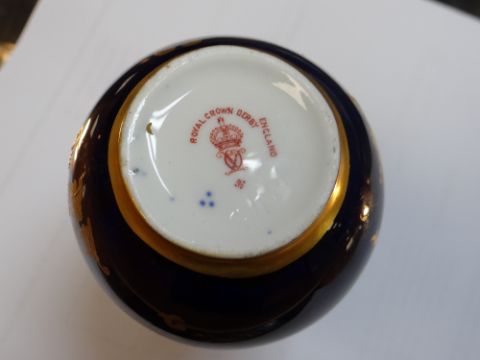 SMALL ROYAL CROWN DERBY PORCELAIN VASE, painted by WILLIAM DEAN WITH vignette of fishing boats, signed with initials within gilt boarders of a mazarine blue ground, 10.5cms high