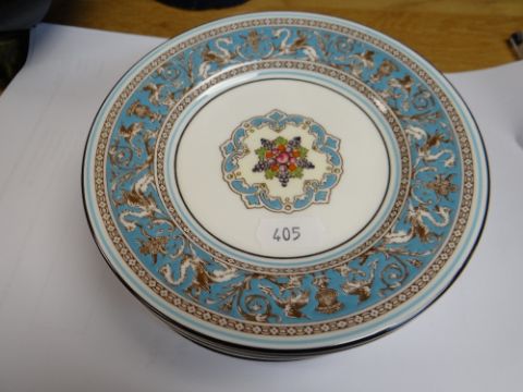 WEDGWOOD BONE CHINA 'FLORENTINE TURQUOISE' PATTERN DINNER SERVICE FOR SIX, including two tureens, gravy boat, six sizes of dinner platesEight dinner platesEight medium sized platesTwelve side platesFive small platesNine saucer type platesSix bowlsTwo tureensOne gravy boat.There are no chips or cracks. No cutlery marks on the plates.One tureen has some staining around the rim  (see photographs)