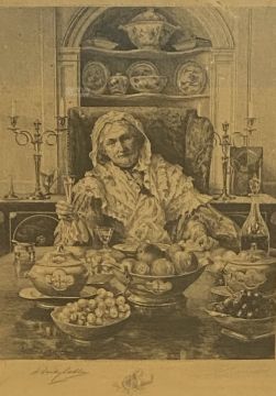 W DENDY SADLER antique print - a lady and a table, signed in pencil, 45 x 32cms, a print of Victoria's Royal Family and a signed photograph of a ship at sea